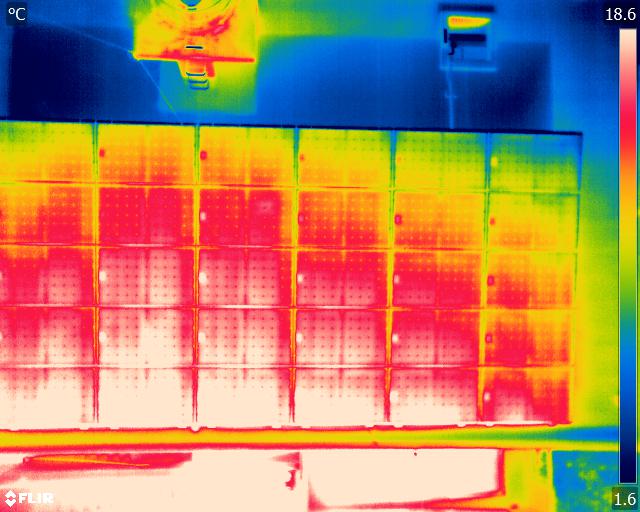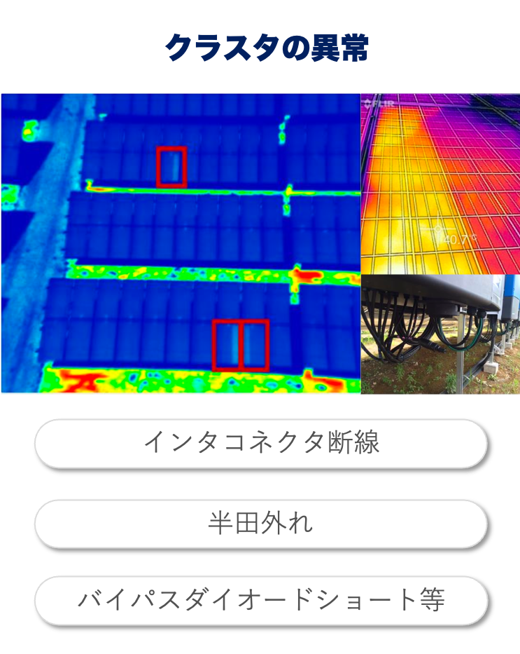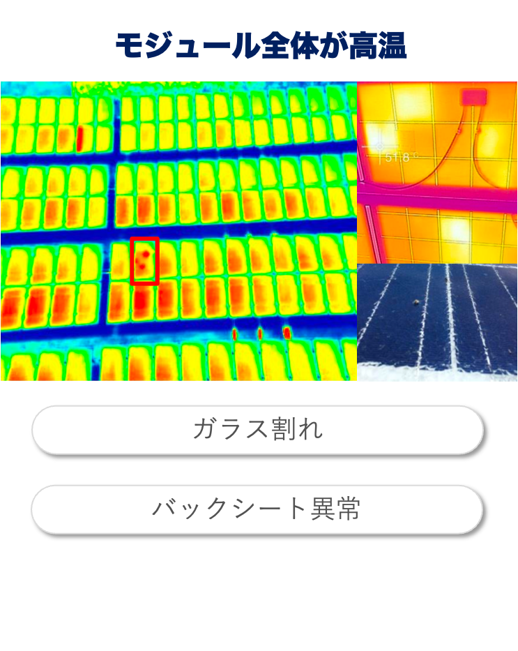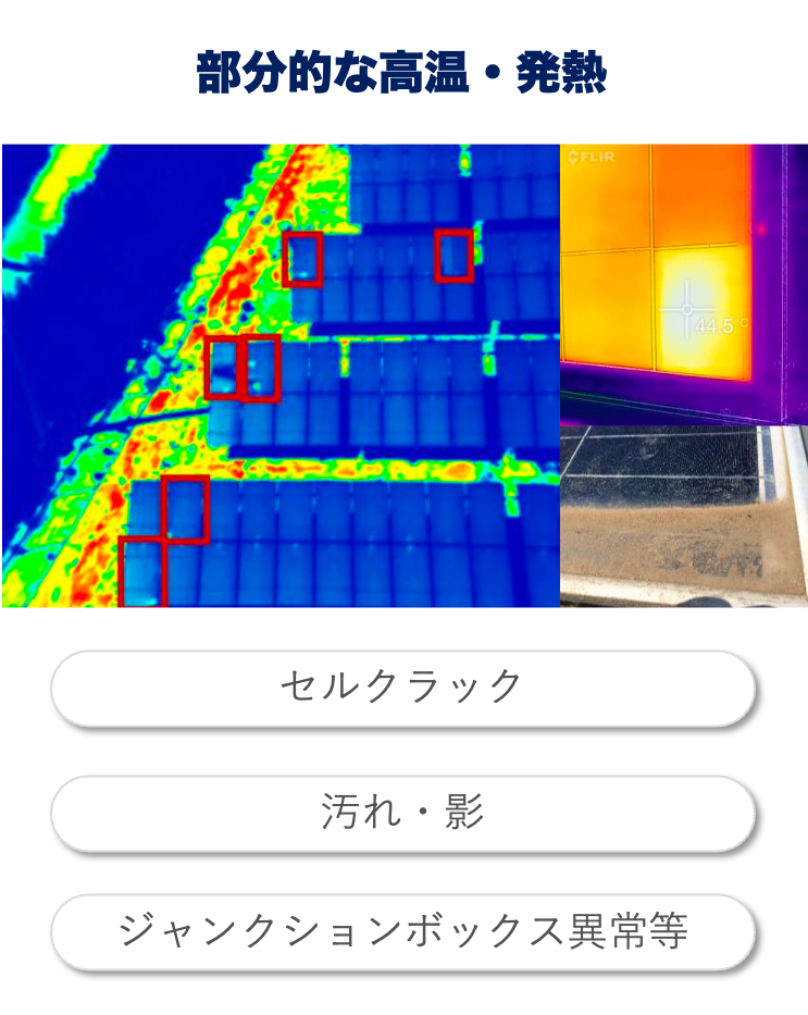 太陽光パネルの内部にヘアラインクラックや不良な接触部分などがある場合、電流が集中して熱が発⽣し正常箇所より⾼温になります。このため⾚外線カメラによって、パネルの表⾯温度の温度差を検知し異常箇所を検出することができます。