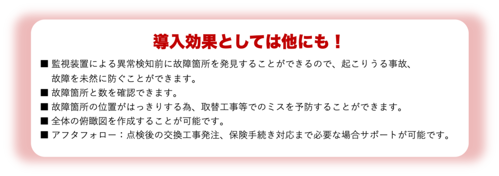 ⾚外線カメラを搭載したドローンを使⽤した太陽光パネルの点検は、太陽光発電システムの健全性を確保するために⾏われます。この技術によって、太陽光発電システムの点検が、従来より低コストで迅速かつ正確に⾏えるようになります。