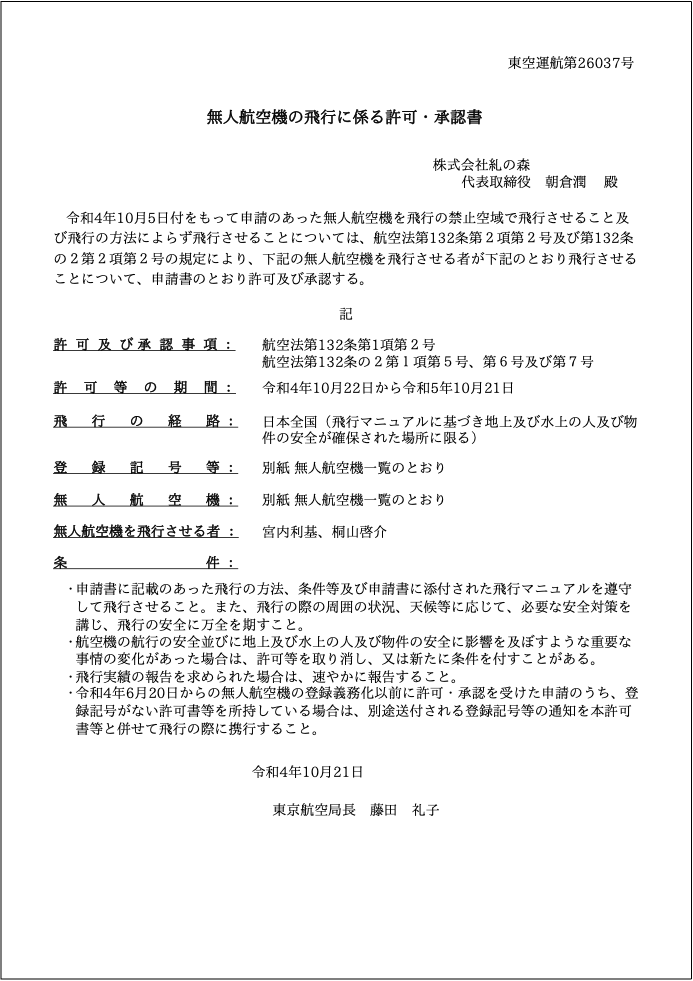無人航空機の飛行に係る許可・承認取得済み